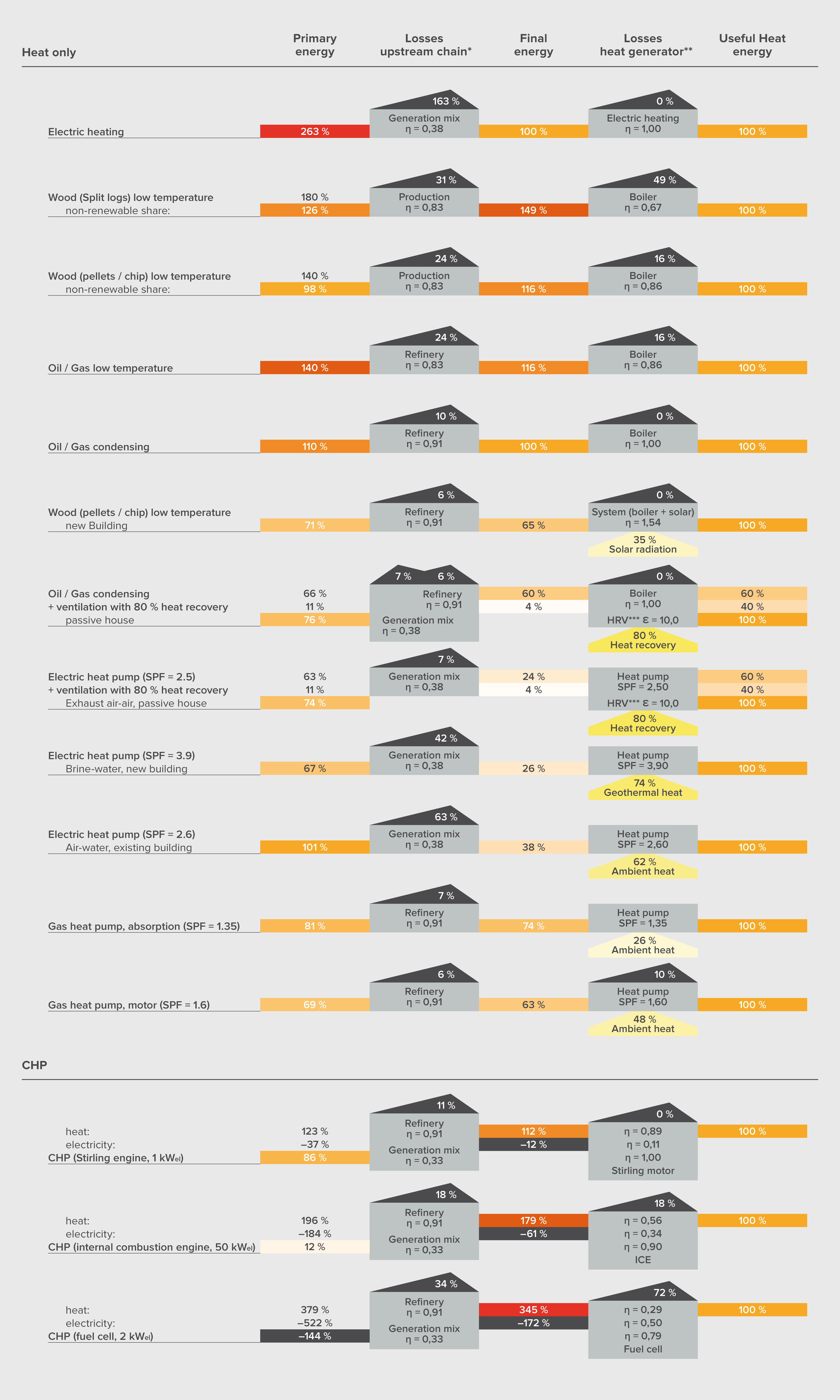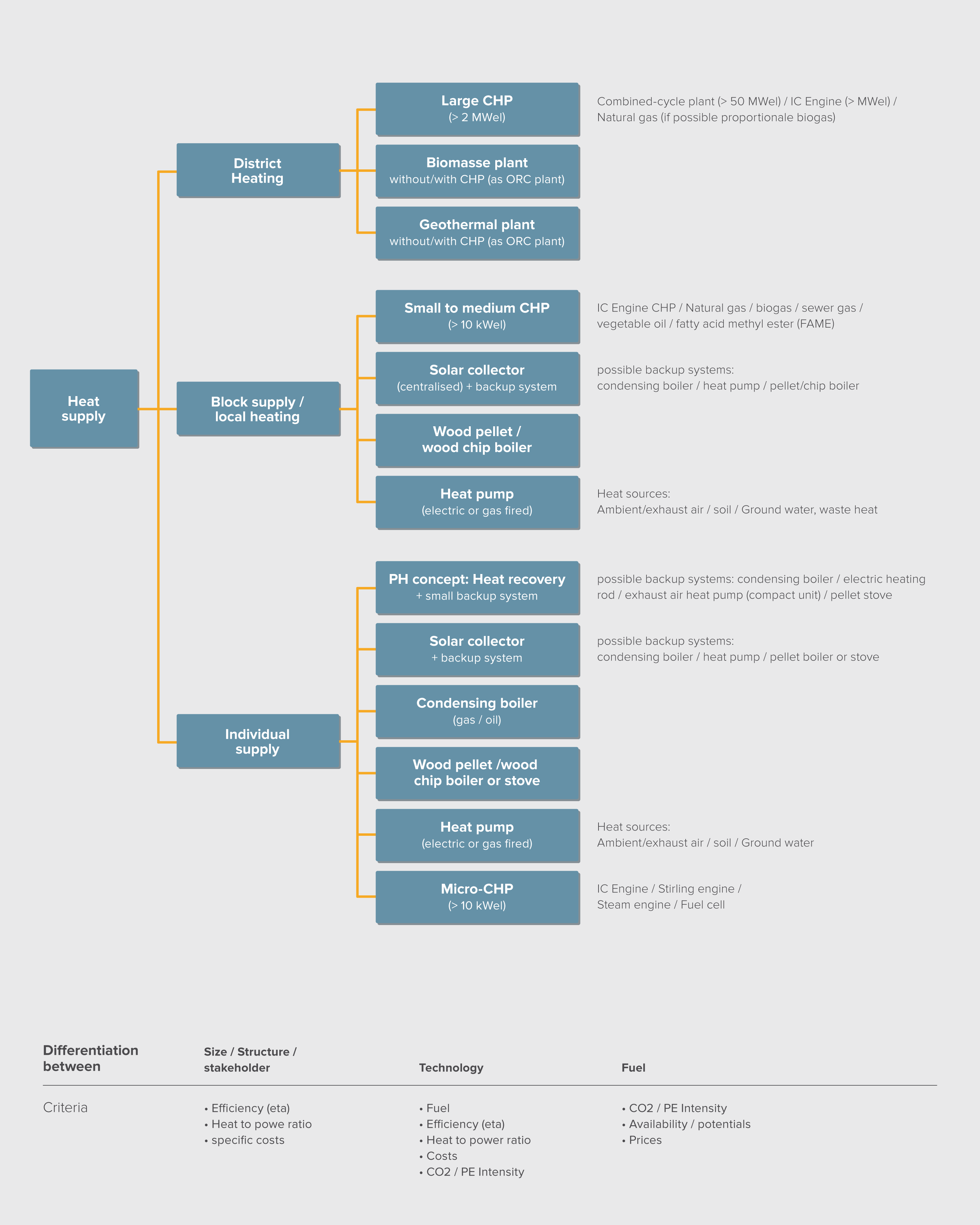 Within each group several technical heat supply options can be found. This section presents a selection of relevant and future-orientated technological options. They differ particularly in terms of energy efficiency, specific costs, heat to power ratio (for CHP plants) and specific CO2 emissions and are dealt in detail in the corresponding sub categories.