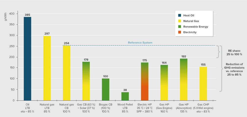 The strategic approach for selecting an appropriate heating system should be: Firstly reduce the building’s heating demand through passive design options, secondly choose an energy-efficient heating system with low GHG emissions and if possible with cogeneration of heat and power, thirdly - if possible - supplied or supported by local renewable resources (solar energy, geothermal or ambient heat, sustainable biomass).